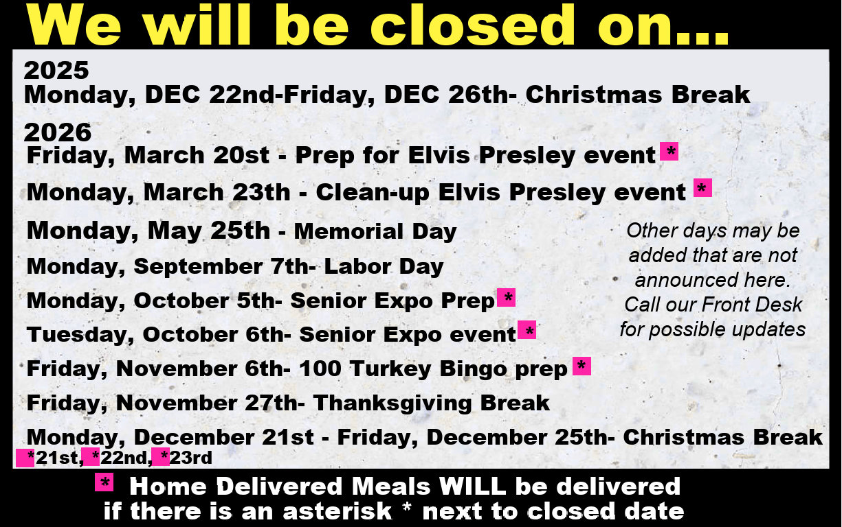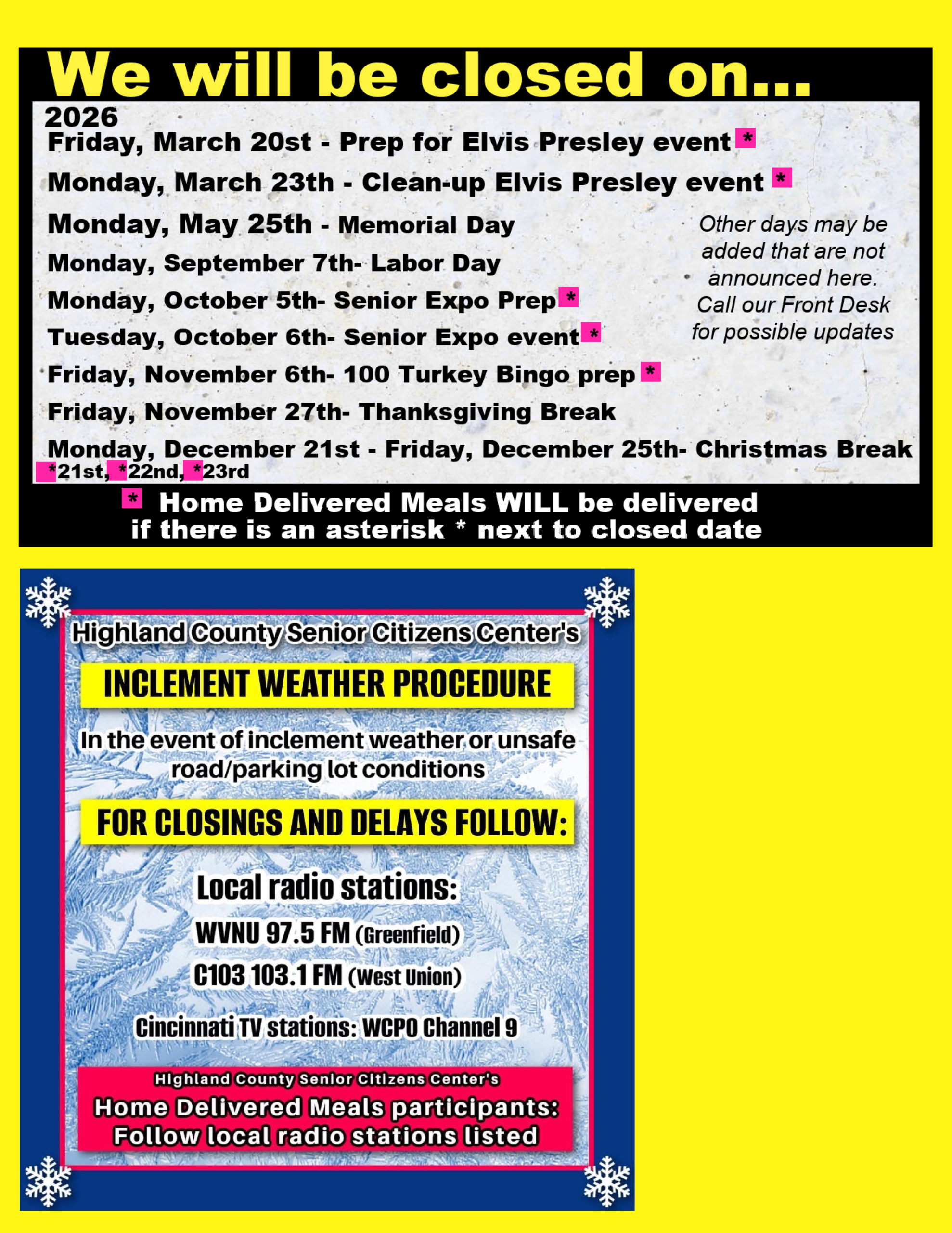 You don't have to be a resident of Highland County to join! 2026 Memberships: Typical Membership: ages 50-89 is $50 per year Lifetime Membership: ages 90+ is free, you must register Associate Membership: ages 21-49 is $55 per year. This membership is a great way to support our organization, even if you're not able to participate in our activities at this time. All memberships expire on December 31st. We are a 501(C)(3) non-profit and non-government funded organization. Donations to our organization can be tax deductible. Please let us know if you need an invoice, receipt or other tax information. Thank you; we appreciate your support!